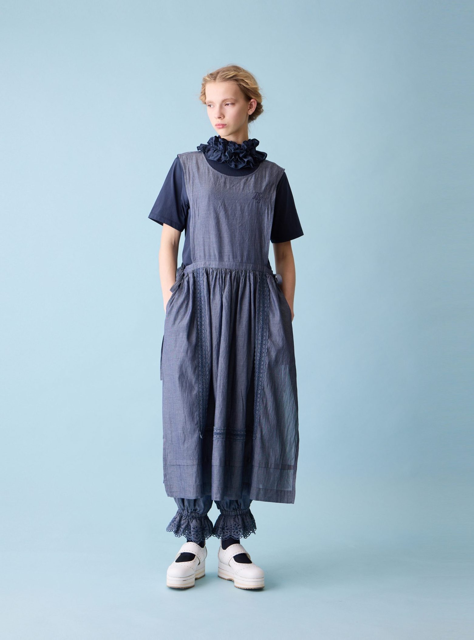 Sheer denim lace-trim tablier