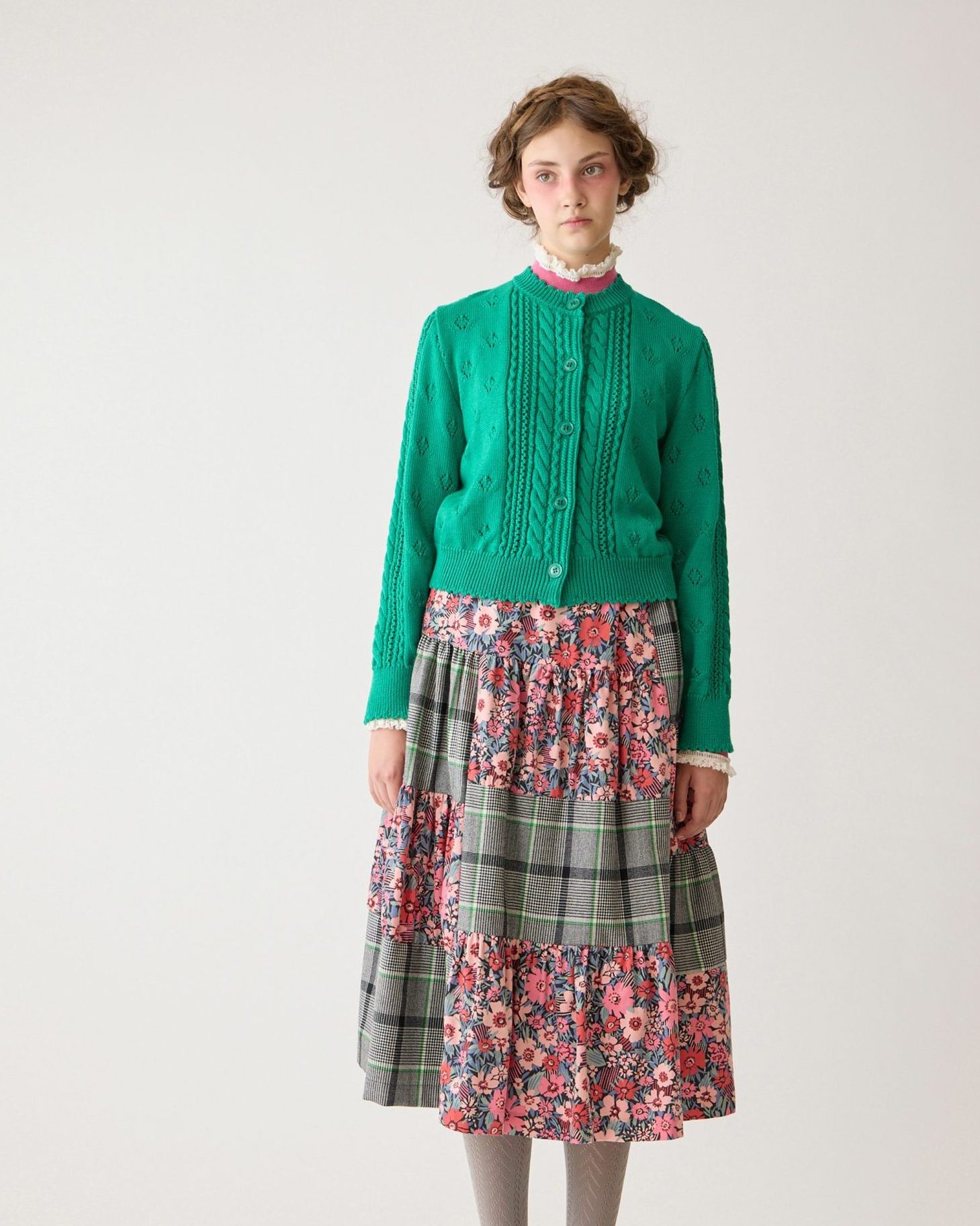 The series with this Liberty pattern printed on corduroy, a fabric suited for this season, is complete with the low gauge knit in bright colors, making a cute British look.