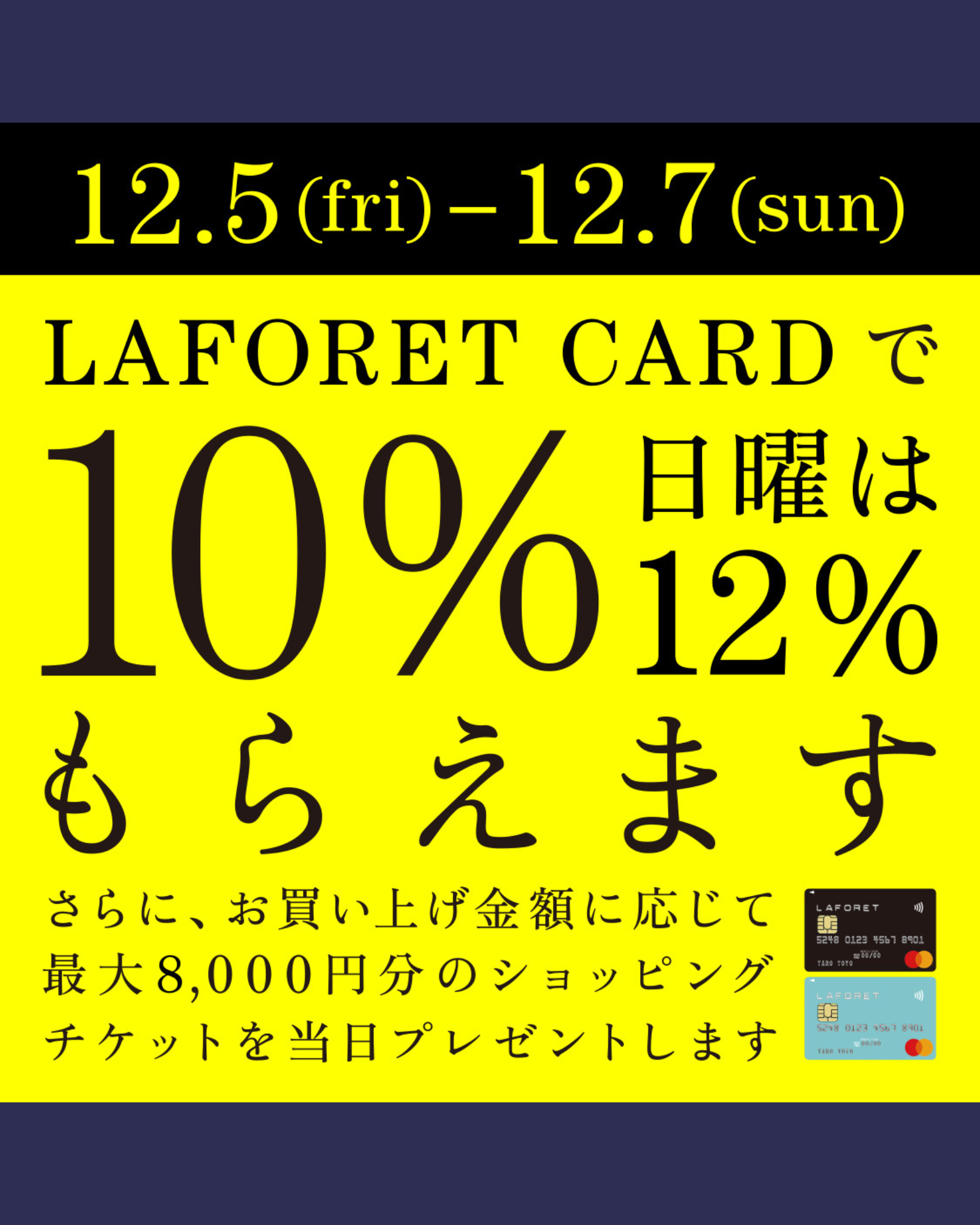 12/5 (FRI) - 12/7 (SUN)の3日間、ラフォーレカードご利用で10%、日曜日は12%分のショッピングチケットをプレゼント。